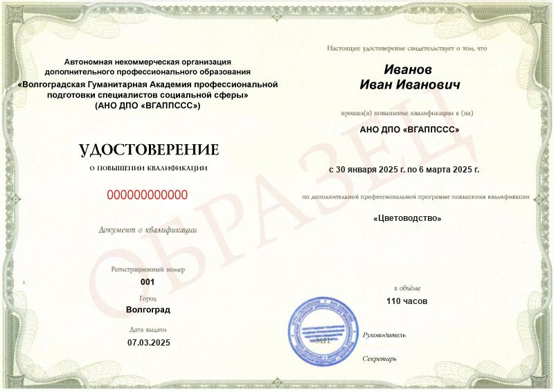 - Удостоверение о повышении квалификации или свидетельство о дополнительном образовании по программе «Цветоводство»