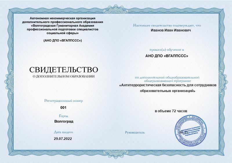 Антитеррористическая безопасность для сотрудников образовательных организаций (72ч)