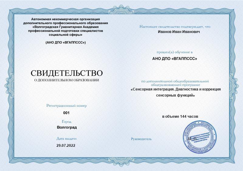 Сенсорная интеграция. Диагностика и коррекция сенсорных функций (144ч)