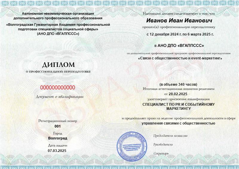 Обучение по такой программе – способ освоить новую профессию на основе ранее полученного образования. В дипломе выпускника указывается его ФИО, наименование учебной организации, название и длительность программы. Документ заверяется подписью руководителя и печатью АНО ДПО «ВГАППССС».