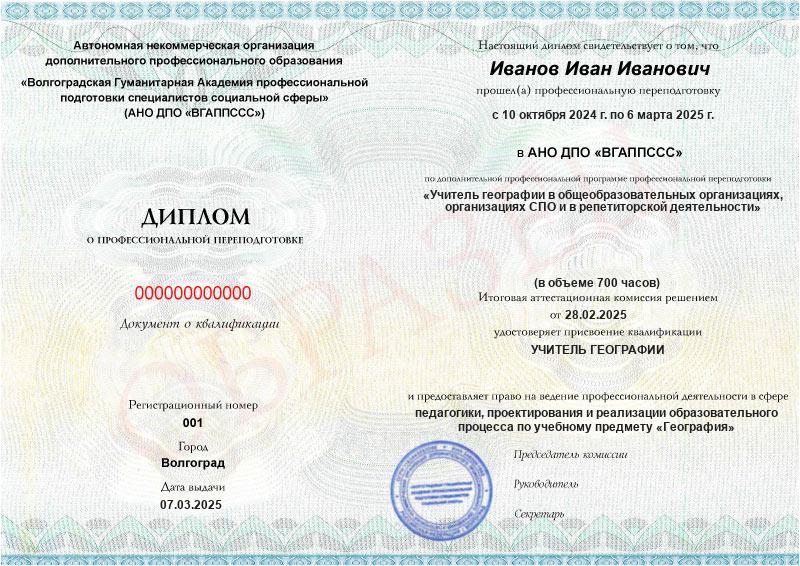Обучение по такой программе – способ освоить новую профессию на основе ранее полученного образования. В дипломе выпускника указывается его ФИО, наименование учебной организации, название и длительность программы. Документ заверяется подписью руководителя и печатью АНО ДПО «ВГАППССС».